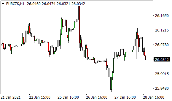 Vývoj měnového páru EUR/CZK (1hodinový graf - H1):