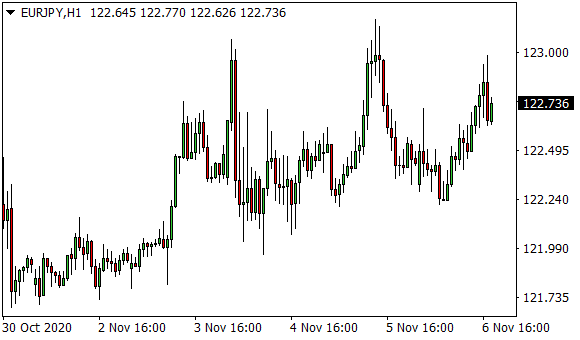 Vývoj měnového páru EUR/JPY (1hodinový graf – H1):