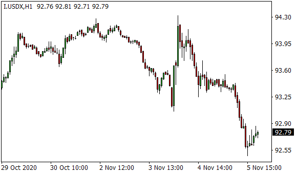 Vývoj dolarového indexu USDX (1hodinový graf – H1):