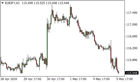 Vývoj měnového páru EUR/JPY (1hodinový graf – H1):