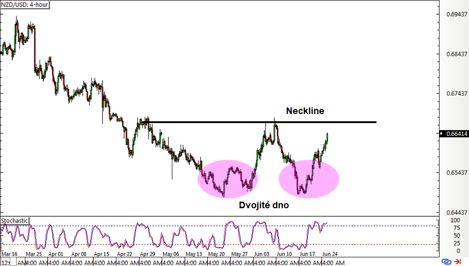 Měnový pár NZD/USD na 4hodinovém grafu utváří formaci dvojité dno. Aby však byla tato formace platná, je zapotřebí jasného prolomení linie neckline kolem hladiny 0,6675 směrem vzhůru. Dočkáme se tohoto scénáře a dalšího růstu? Nicméně, indikátor Stochastic současně již vysílá překoupené signály, což značí možnou vyčerpanost býků.