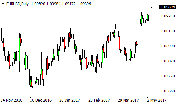 Euro dnes na forexových trzích ve světě vystoupilo vůči americkému dolaru na nové šestiměsíční maximum 1,0991 EUR/USD. Vyhlídky na vítězství centristického kandidáta Emmanuela Macrona ve francouzských prezidentských volbách totiž převážily nad příznivými údaji o dubnové situaci na trhu práce ve Spojených státech.