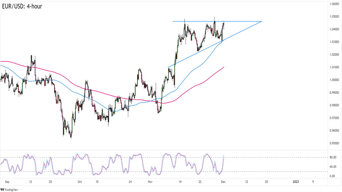 Forex: EUR/USD testuje rezistenci rostoucího trojúhelníku