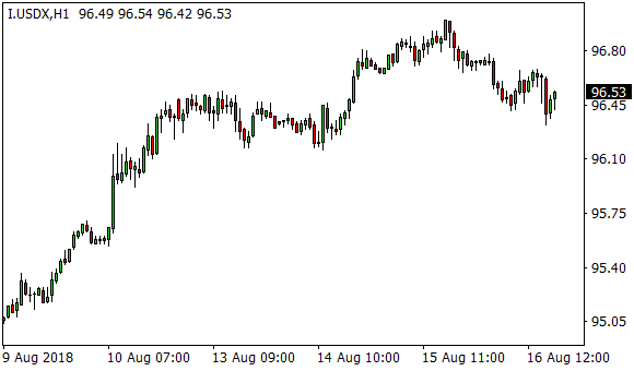 Vývoj dolarového indexu USDX (1hodinový graf – H1):