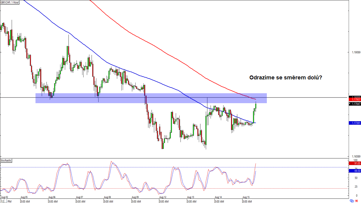Měnový pár GBP/CHF na 1hodinovém grafu aktuálně testuje klíčovou S/R zónu (nyní rezistence) kolem psychologické hladiny 1,1800, která koresponduje s klouzavým průměrem SMA 200. Indikátor Stochastic současně již zasáhl překoupenou oblast, další růst tak může být limitován. Otevření krátké (short) pozice po náznaku odrazu směrem dolů může být dobrý obchodní plán, zejména pokud cílíte na předchozí minima kolem 1,1675.
