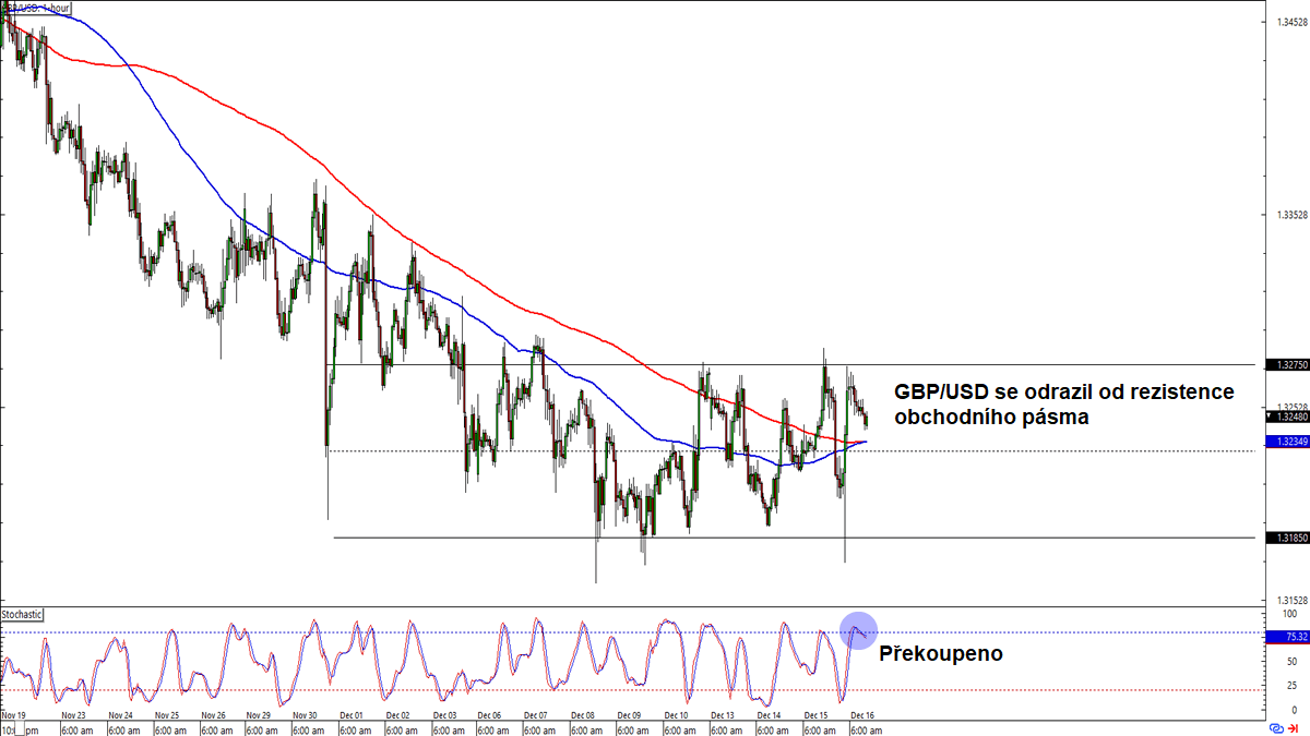 Měnový pár GBP/USD se na 1hodinovém grafu odrazil směrem dolů od rezistence obchodního pásma kolem hladiny 1,3275. Indikátor Stochastic současně již vysílá překoupené podmínky, další růst tak může být limitován. Otevření krátké (short) pozice kolem současných úrovní se Stop-Lossem nad zmíněnou rezistencí tak může být dobrý obchodní plán, zejména pokud cílíte na support obchodního pásma kolem hladiny 1,3185.