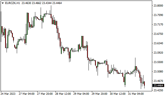 Vývoj měnového páru EUR/CZK (1hodinový graf - H1):