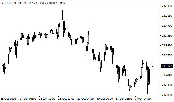 Vývoj měnového páru USD/CZK (1hodinový graf - H1):