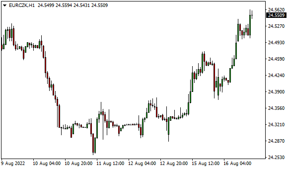 Vývoj měnového páru EUR/CZK (1hodinový graf - H1):