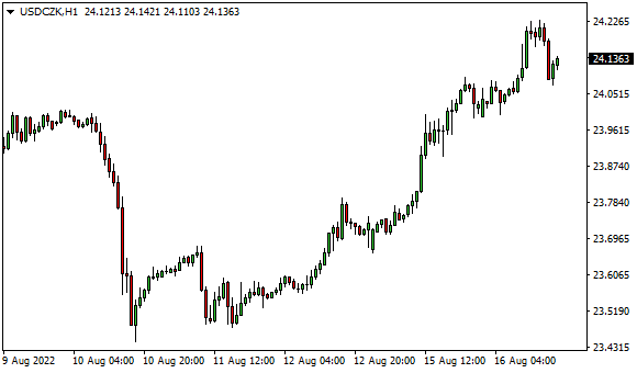 Vývoj měnového páru USD/CZK (1hodinový graf - H1):