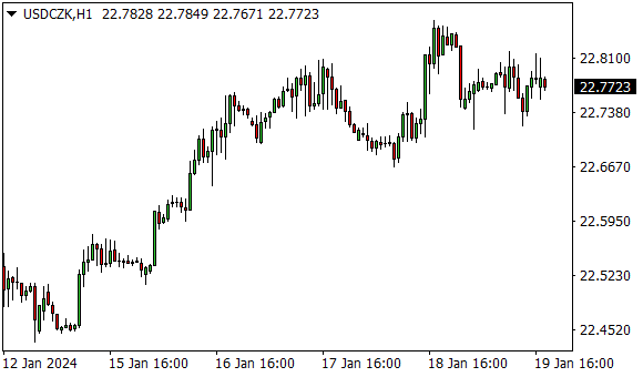 Vývoj měnového páru USD/CZK (1hodinový graf - H1):