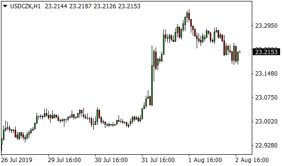 Vývoj měnového páru USD/CZK (1hodinový graf - H1):