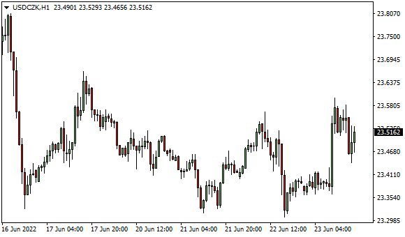 Vývoj měnového páru USD/CZK (1hodinový graf - H1):