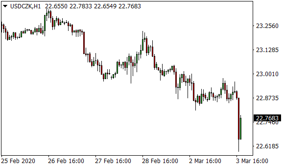 Vývoj měnového páru USD/CZK (1hodinový graf - H1):