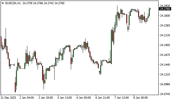 Vývoj měnového páru EUR/CZK (1hodinový graf - H1):