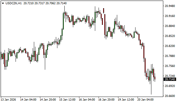 Vývoj měnového páru USD/CZK (1hodinový graf - H1):