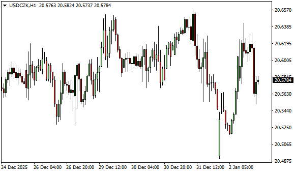 Vývoj měnového páru USD/CZK (1hodinový graf - H1):