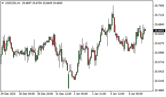 Vývoj měnového páru USD/CZK (1hodinový graf - H1):