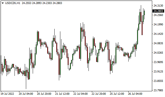 Vývoj měnového páru USD/CZK (1hodinový graf - H1):