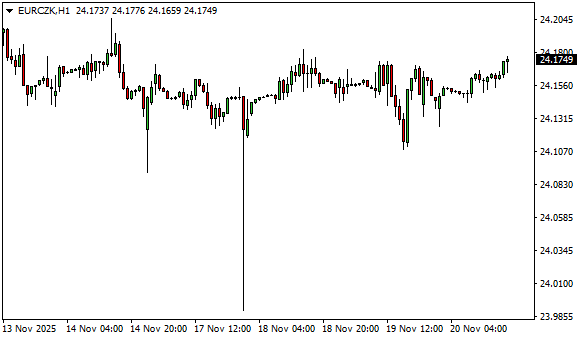 Vývoj měnového páru EUR/CZK (1hodinový graf - H1):