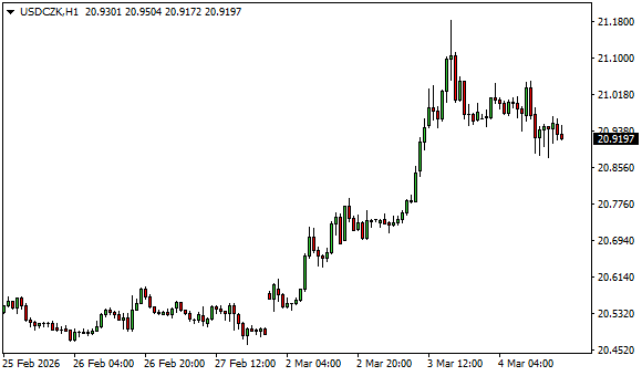 Vývoj měnového páru USD/CZK (1hodinový graf - H1):
