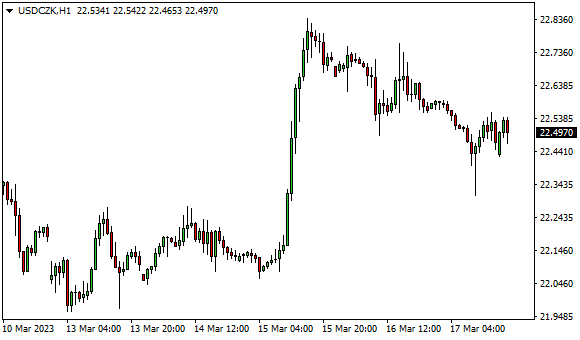 Vývoj měnového páru USD/CZK (1hodinový graf - H1):