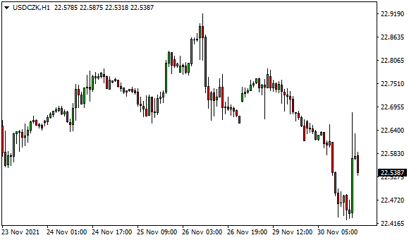 Vývoj měnového páru USD/CZK (1hodinový graf - H1):
