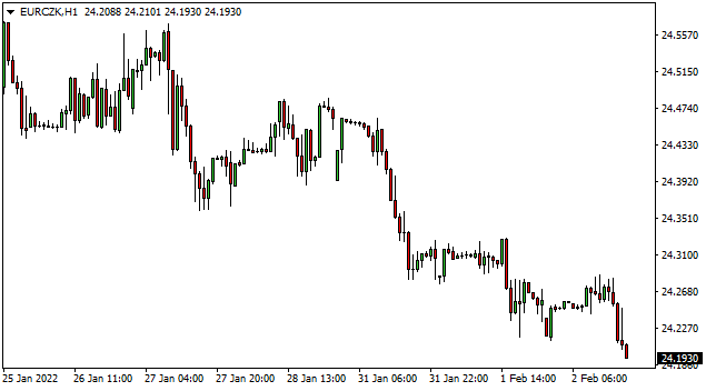 Vývoj měnového páru EUR/CZK (1hodinový graf - H1):