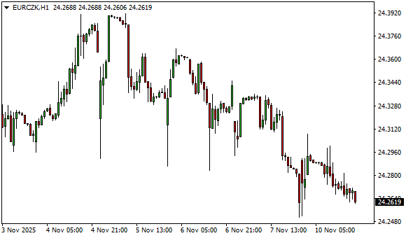 Vývoj měnového páru EUR/CZK (1hodinový graf - H1):