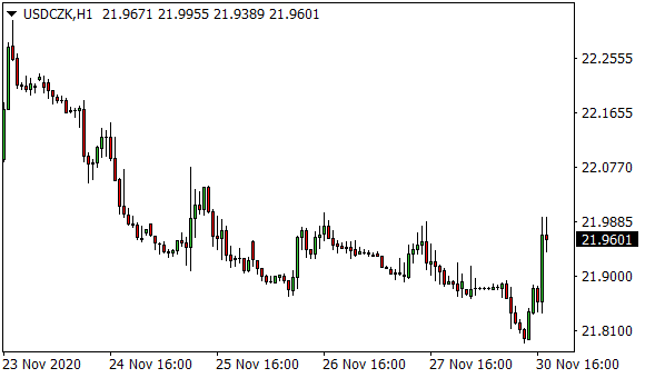 Vývoj měnového páru USD/CZK (1hodinový graf - H1):