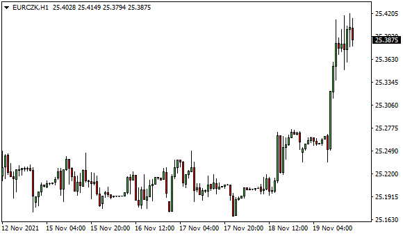 Vývoj měnového páru EUR/CZK (1hodinový graf - H1):