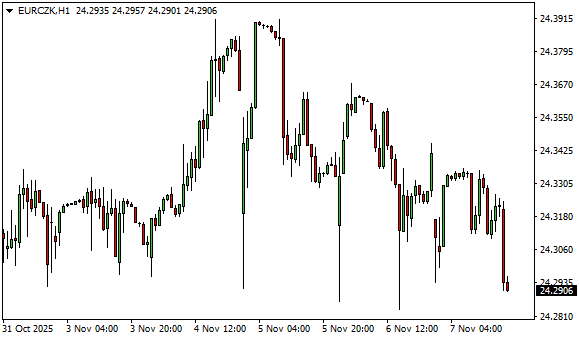 Vývoj měnového páru EUR/CZK (1hodinový graf - H1):