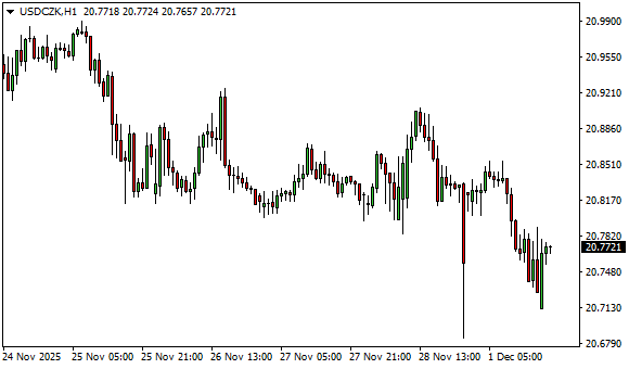 Vývoj měnového páru USD/CZK (1hodinový graf - H1):