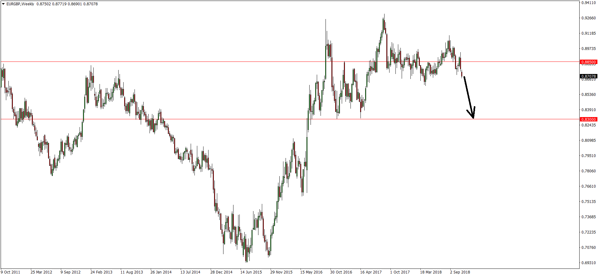 Vývoj měnového páru EUR/GBP (týdenní graf - W1):