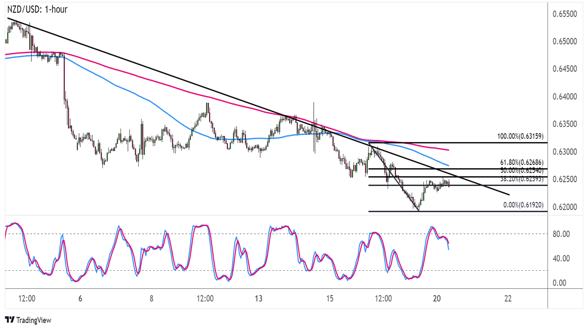 Měnový pár NZD/USD na 1hodinovém grafu aktuálně testuje úroveň 38,2 % Fibonacciho retracementu kolem psychologické hladiny 0,6250, která se nachází poblíž klesající trendové linie. Dočkáme se tedy odrazu od zmiňované Fibonacciho úrovně a pokračování klesajícího trendu?