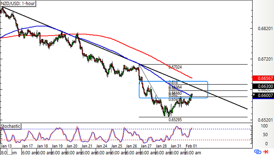 Měnový pár NZD/USD na 1hodinovém grafu aktuálně testuje úroveň 38,2 % Fibonacciho retracementu kolem psychologické hladiny 0,6600, která koresponduje s klouzavým průměrem SMA 100. Indikátor Stochastic současně již vysílá překoupené podmínky, další růst tak může být limitován. Dočkáme se tedy odrazu od zmiňované úrovně Fibonacciho retracementu a oslabení k nižším hodnotám?