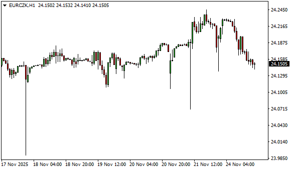 Vývoj měnového páru EUR/CZK (1hodinový graf - H1):