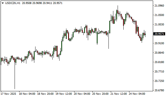 Vývoj měnového páru USD/CZK (1hodinový graf - H1):
