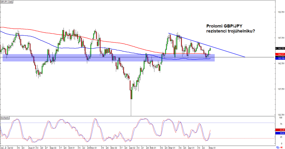 Měnový pár GBP/JPY se na denním grafu obchoduje v klesajícím trojúhelníku a momentálně směřuje k jeho rezistenci. Indikátor Stochastic již opustil přeprodanou oblast, a tak bychom se mohli dočkat průrazu zmíněné rezistence směrem vzhůru. Nastane tento scénář nebo dojde naopak k návratu zpět směrem k supportu trojúhelníku, který koresponduje s klouzavými průměry SMA 100 a SMA 200?