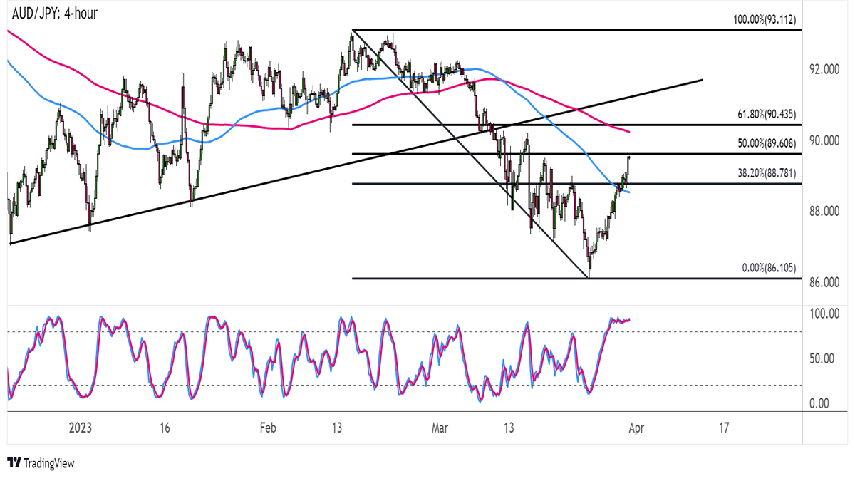 Měnový pár AUD/JPY na 4hodinovém grafu testuje úroveň 50 % Fibonacciho retracementu kolem hladiny 89,60, který se nachází pod již dříve prolomenou oblastí supportu rostoucí trendové linie (pullback - nyní rezistence). Dočkáme se posílení do této zmíněné oblasti (pullback) a následného odražení zpět k nižším úrovním? Nicméně, indikátor Stochastic již signalizuje překoupené podmínky, další růst tak může být limitován.