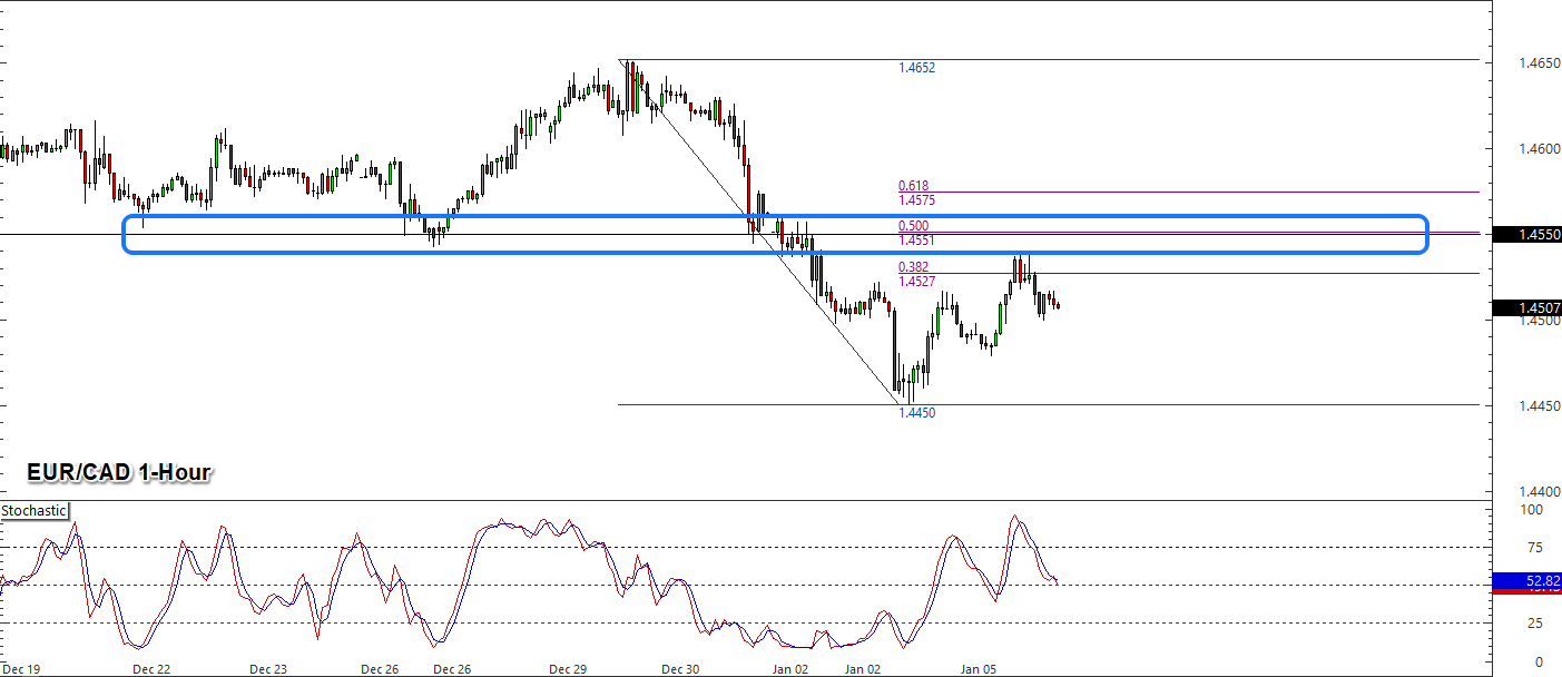 Měnový pár EUR/CAD se na 1hodinovém grafu v rámci korekce předchozího poklesu postupně vrací zpět směrem k již dříve prolomené oblasti supportu (nyní rezistence) kolem hladiny 1,4550, který koresponduje s úrovní 50 % Fibonacciho retracementu. Dočkáme se posílení do této oblasti a následného odražení zpět k nižším úrovním nebo již můžeme tuto oblast považovat za otestovanou?