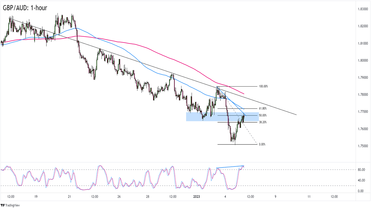 Měnový pár GBP/AUD na 1hodinovém grafu aktuálně testuje již dříve prolomenou oblast supportu (pullback - nyní rezistence) kolem hladiny 1,7700, která koresponduje s úrovní 50 % Fibonacciho retracementu. Mezi cenou a indikátorem Stochastic současně vznikla skrytá medvědí divergence, další růst tak může být limitován. Otevření krátké (short) pozice kolem současných úrovní tak může být dobrý obchodní plán, zejména pokud cílíte na předchozí minima kolem 1,7500.