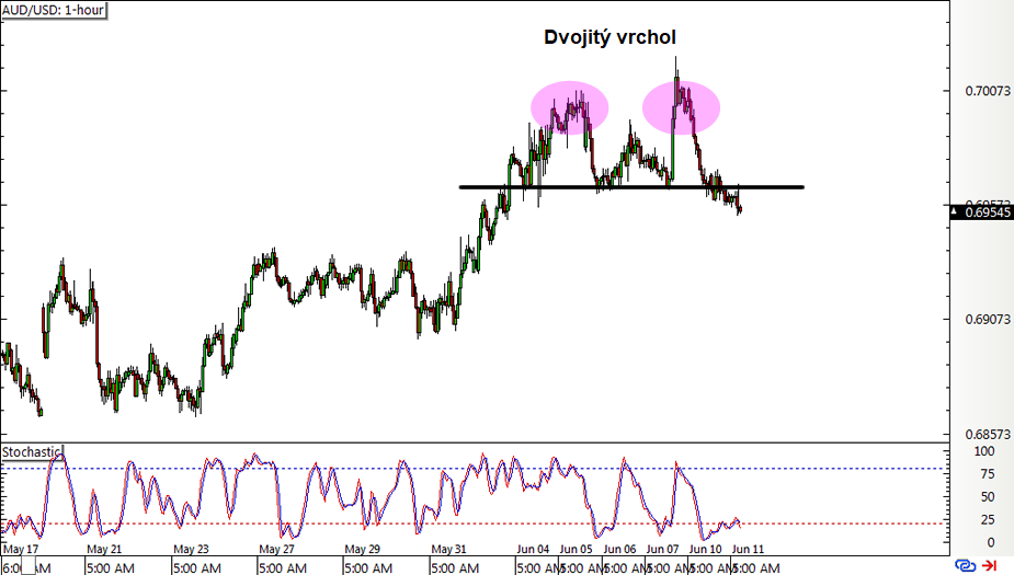 Při pohledu na 1hodinový graf tento měnový pár utvořil formaci dvojitý vrchol a aktuálně proráží směrem dolů linii neckline této formace, což může být signál ke vstupu do krátké (short) pozice.