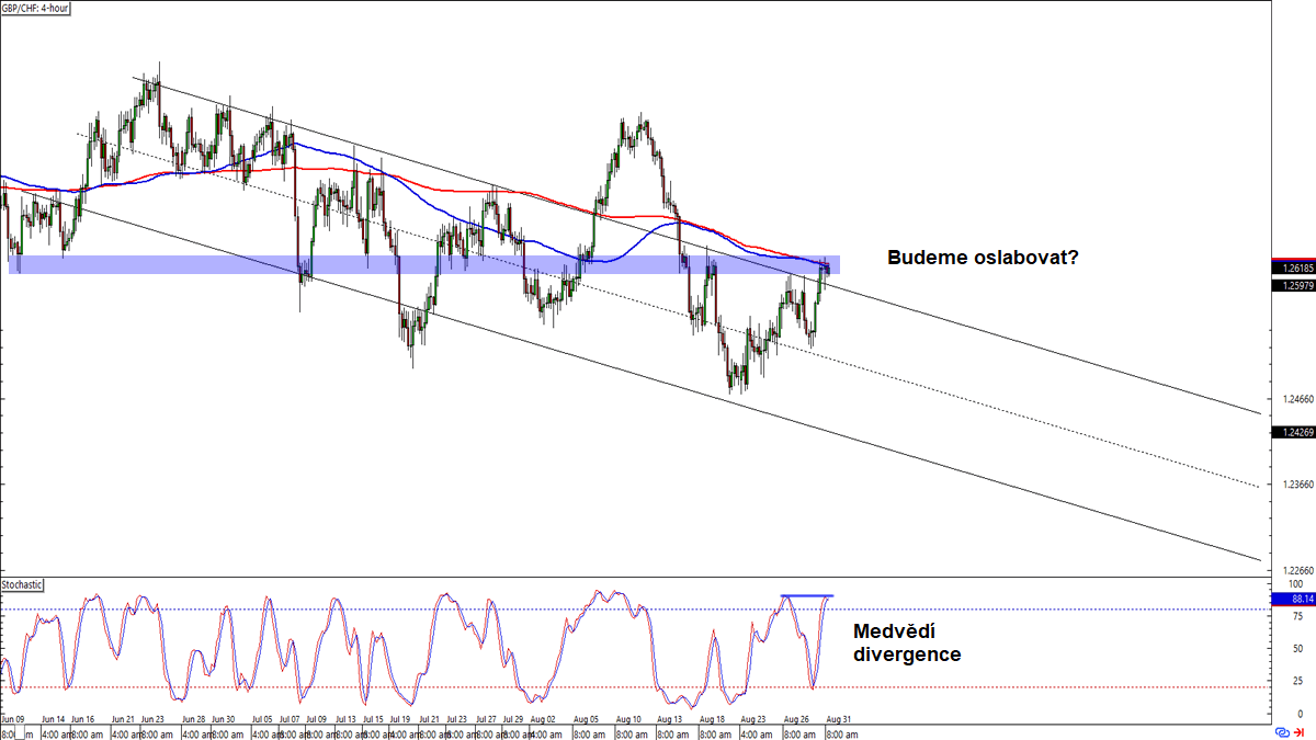 Měnový pár GBP/CHF na 4hodinovém grafu aktuálně testuje vyznačenou S/R zónu (nyní rezistence) kolem hladiny 1,2625, která koresponduje s klouzavými průměry SMA 100 a SMA 200. Tato oblast se nachází těsně nad rezistencí klesajícího trendového kanálu. Mezi cenou tohoto měnového páru a indikátorem Stochastic se zde současně utváří standardní medvědí divergence. Otevření krátké (short) pozice po náznaku odražení směrem dolů tak může být dobrý obchodní plán, zejména pokud cílíte na support trendového kanálu.