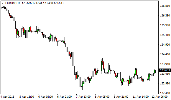Vývoj měnového páru EUR/JPY (1hodinový graf – H1):
