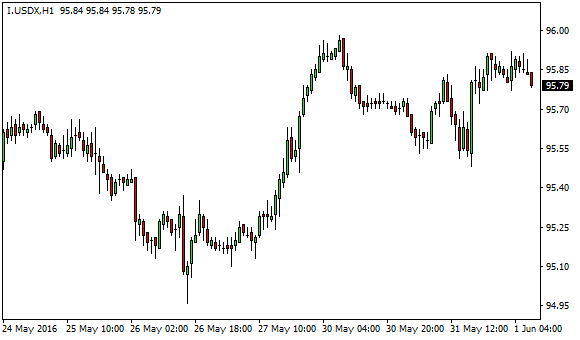 Vývoj dolarového indexu USDX (1hodinový graf – H1):