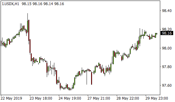 Vývoj dolarového indexu USDX (1hodinový graf - H1):