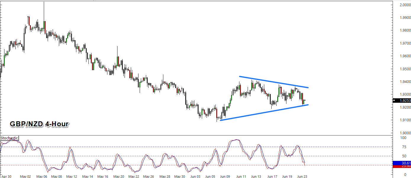 GBP/NZD: Tento měnový pár se na 4hodinovém grafu obchoduje v symetrickém trojúhelníku a momentálně se nachází v těsné blízkosti jeho supportu. Dočkáme se průrazu tohoto supportu směrem dolů a dalšího oslabení? Indikátor Stochastic zatím nezasáhl přeprodanou oblast, prostor pro pokles by tak mohl stále být.