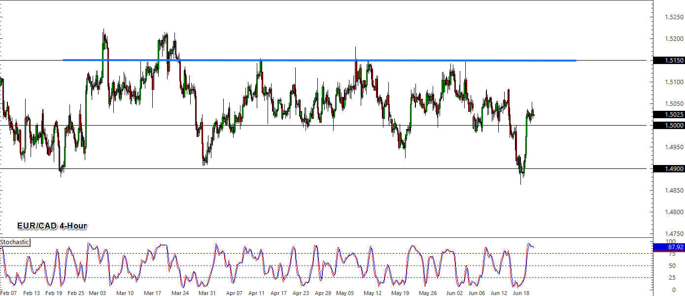 EUR/CAD: Tento měnový pár se na 4hodinovém grafu obchoduje v bočním pásmu mezi supportem 1,4900 a rezistencí 1,5150, ke které má po překonání středové linie tohoto pásma namířeno. Nicméně, indikátor Stochastic již současně signalizuje překoupené podmínky, další růst tak může být limitován.