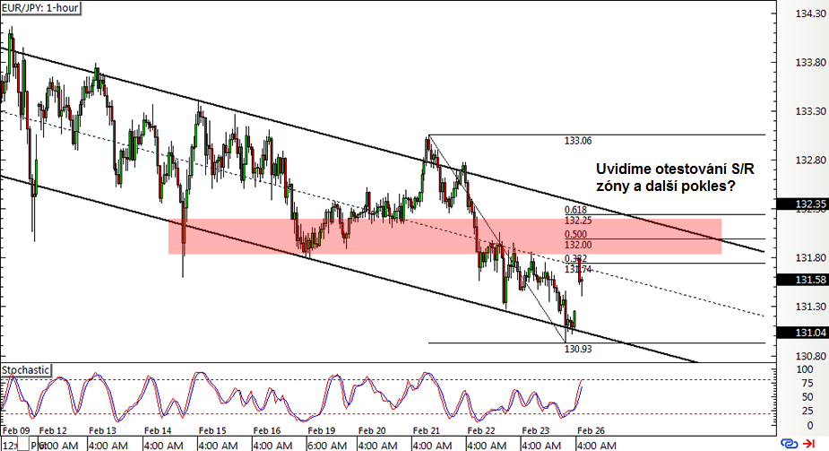 EUR/JPY: Tento měnový pár se na denním grafu aktuálně nachází v blízkosti klíčového supportu okolo psychologické hladiny 132,00. Indikátor Stochatic zároveň zasáhl přeprodanou oblast, což značí možnou vyčerpanost medvědů. Dočkáme se tak odražení od tohoto supportu zpět k vyšším úrovním nebo naopak dojde k prolomení a dalšímu poklesu? -